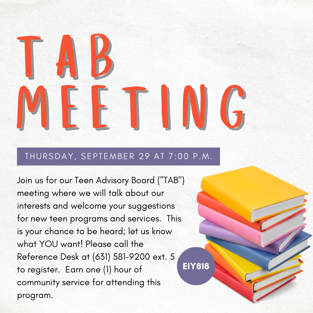 Join us for our bi-monthly TAB meeting where we will talk about our interests and welcome your suggestions for new teen programs and services. This is your chance to be heard; let us know what YOU want! Earn one (1) hour of community service for attending this program. To register for this program, please click here.